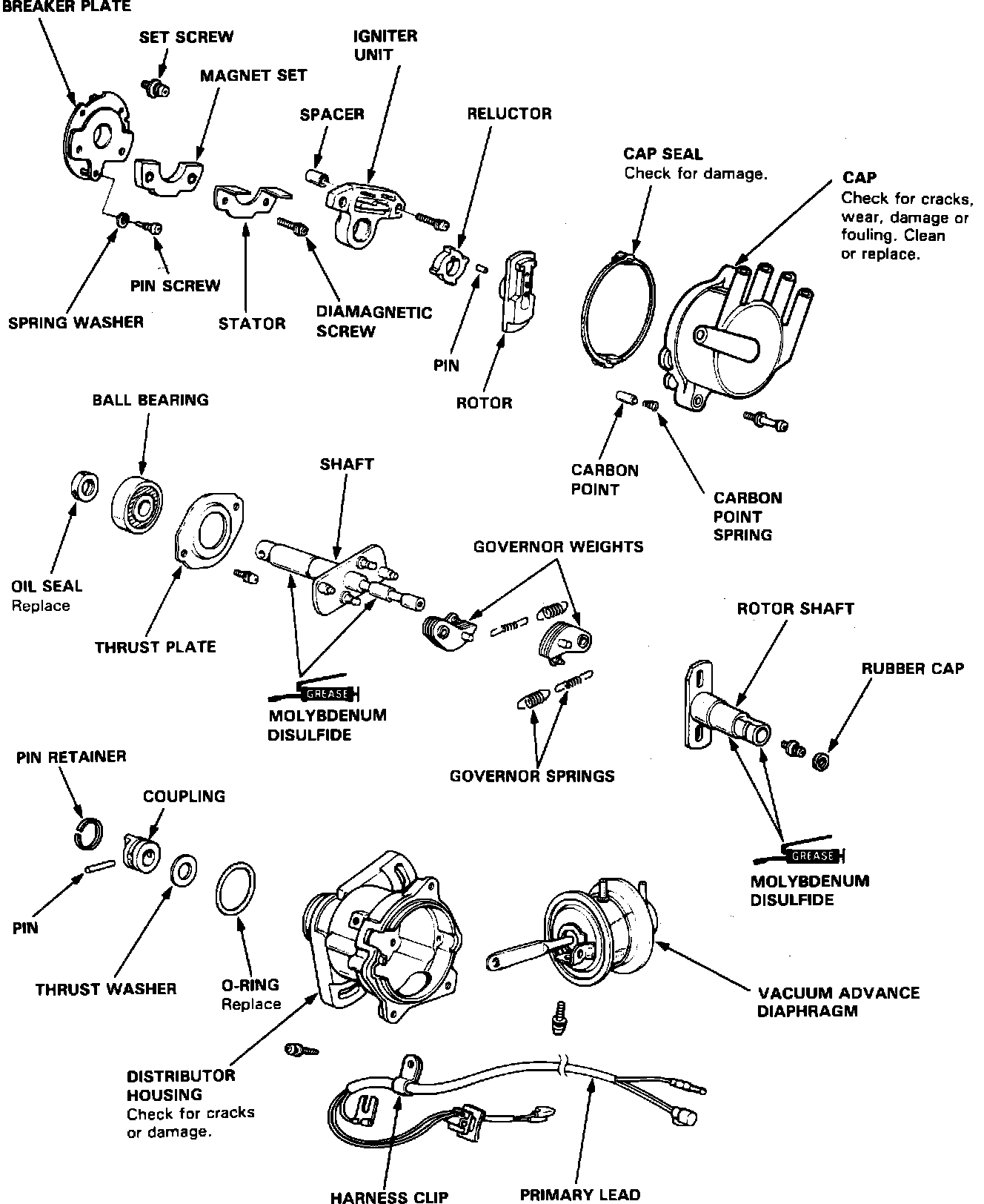 The distributor acts as a rotary switch. As the reluctor rotates inside the distributor it produces a voltage pulse in the pick-up coil. The voltage pulse is transmitted to the power transistor which interrupts current flow in the primary circuit. The interruption induces high voltage in the secondary coil and fires a spark plug. The pick-up coil/igniter assembly is located inside the distributor. The rotating distributor rotor distributes the high voltage to the distributor cap, secondary wires, and to the appropriate spark plug.