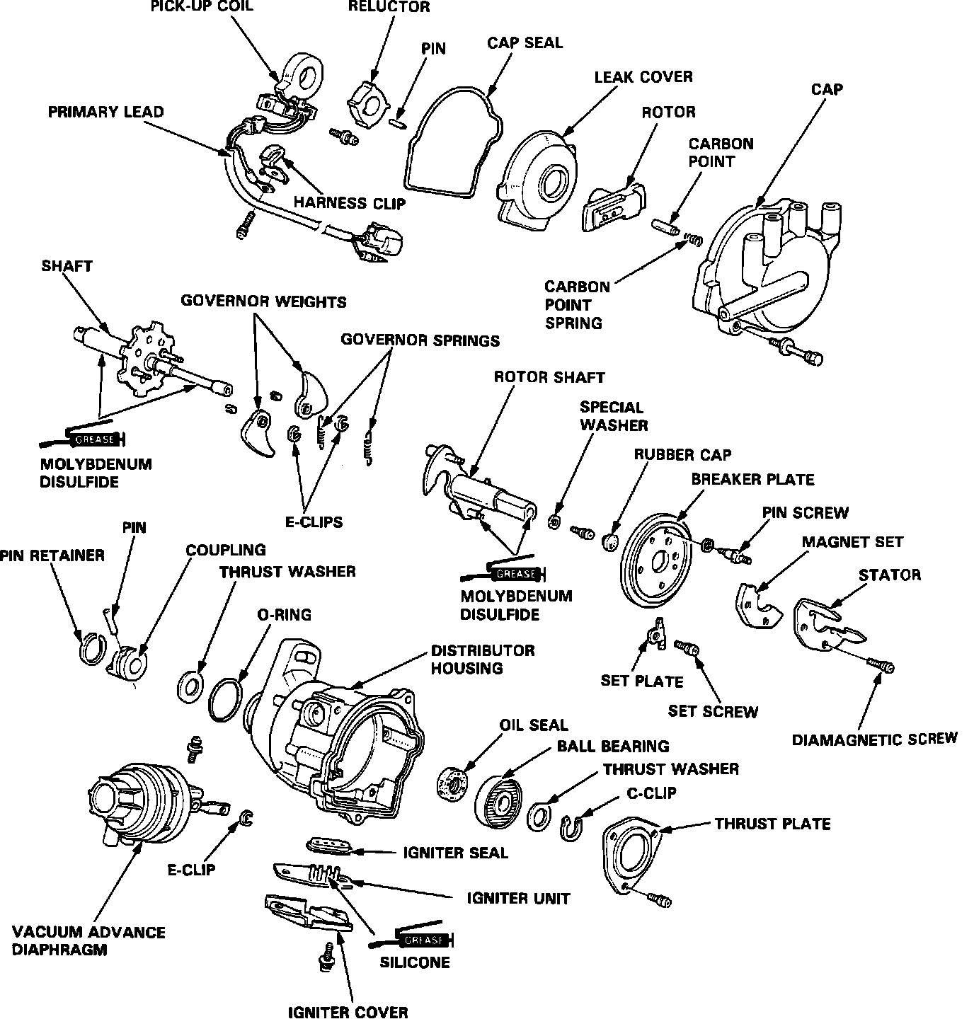 The distributor acts as a rotary switch. As the reluctor rotates inside the distributor it produces a voltage pulse in the pick-up coil. The voltage pulse is transmitted to the power transistor which interrupts current flow in the primary circuit. The interruption induces high voltage in the secondary coil and fires a spark plug. The pick-up coil is located inside the distributor and utilizes an external igniter bolted to the side of the distributor. The rotating distributor rotor distributes the high voltage to the distributor cap, secondary wires, and to the appropriate spark plug.