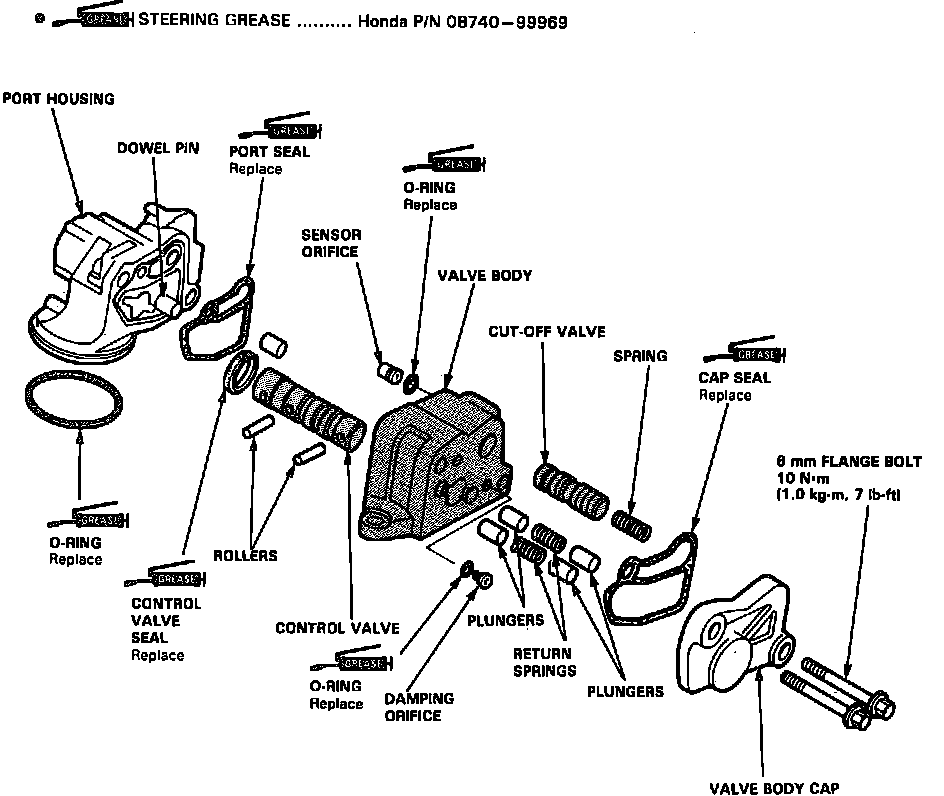 Replace all O-rings and seals, and coat O-rings and friction surfaces with power steering fluid during assembly.