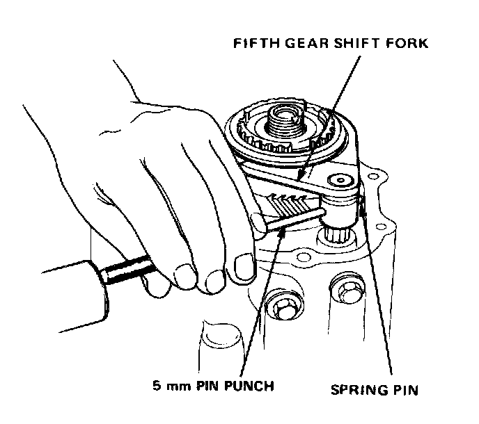 7. Drive out spring pin securing fifth gear shift fork to shaft.