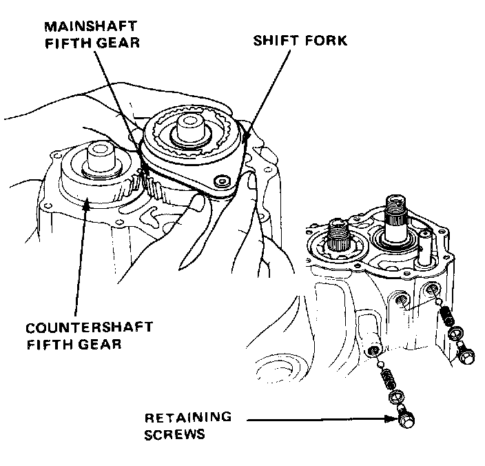 8. Remove mainshaft fifth gear, shift fork, synchronizer sleeve, hub, ring and spring as a unit.