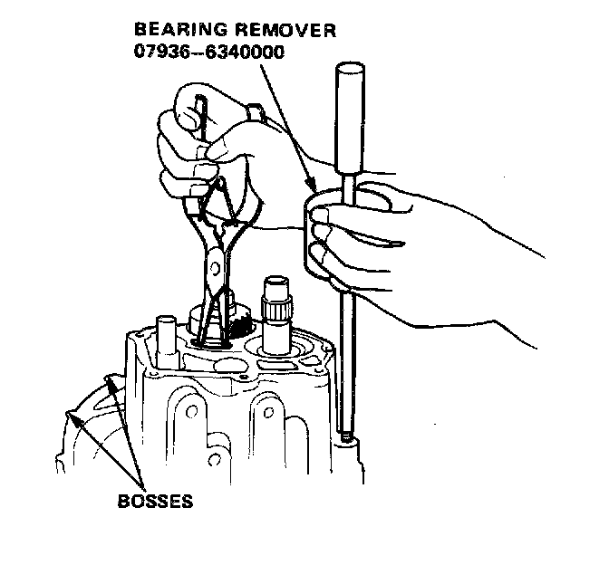 13. Loosen the transmission housing by tapping on bosses around its edge with a soft hammer. Remove the attachment from the remover then screw its threaded end into the hole in the transmission housing as shown. Expand the snap ring while tapping upward on the case using the bearing remover.