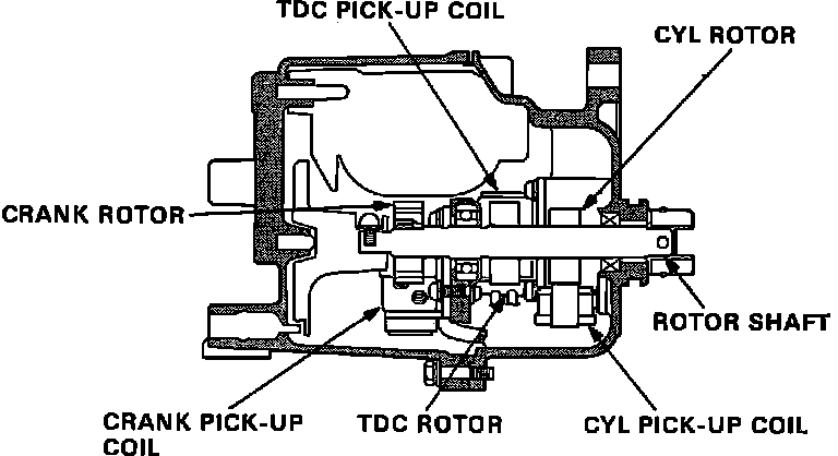 The CRANK sensor determines timing for ignition and fuel injection. The CRANK pulses are also used to determine engine rpm. The TDC sensor determines ignition during the start-up (cranking) procedure or when the crank signal is abnormal. The CYL sensor detects the position of No.1 cylinder for sequential fuel injection to each cylinder.