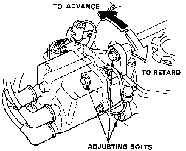 5. Adjust if necessary by loosening the distributor adjusting bolts, and turning the distributor housing counterclockwise to advance the timing, or clockwise to retard the timing.