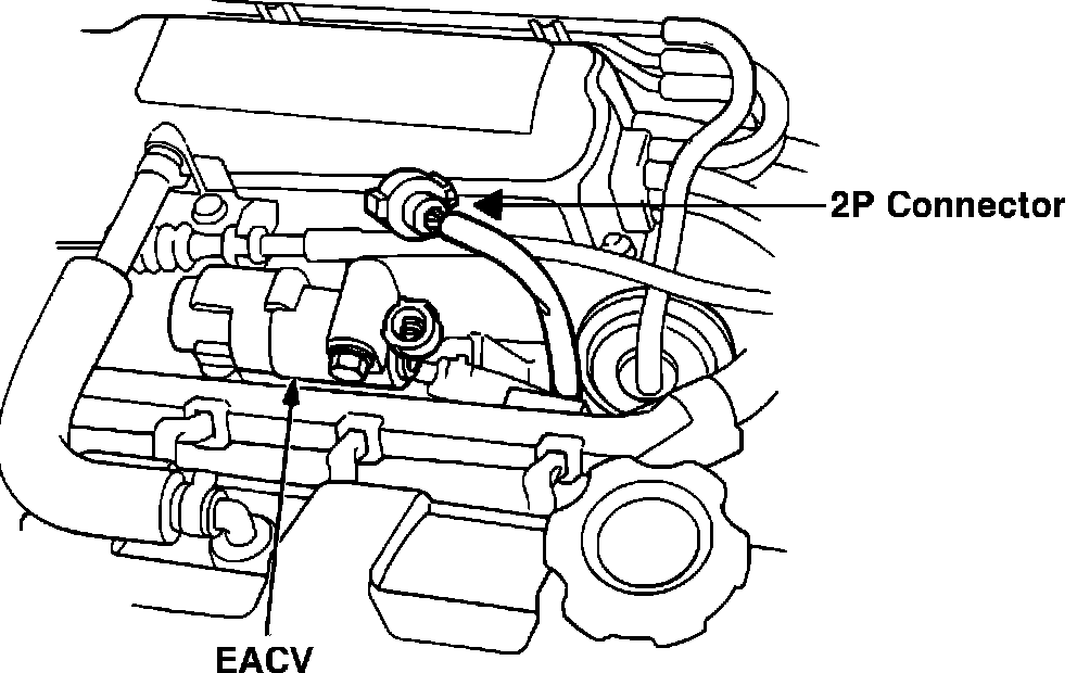 5. Reconnect the 2P connector to the EACV, turn the ignition switch OFF, remove the CLOCK (10 Amp) fuse in the underhood relay box for 10 seconds to reset the ECU.