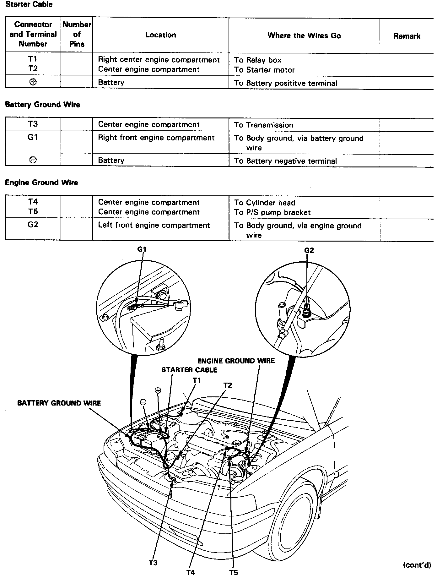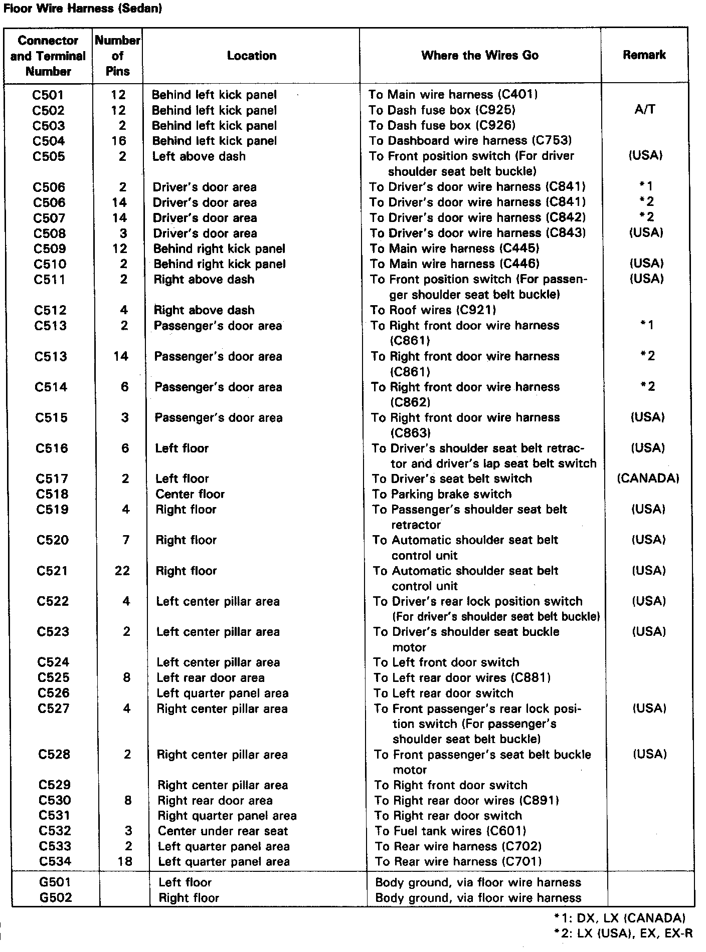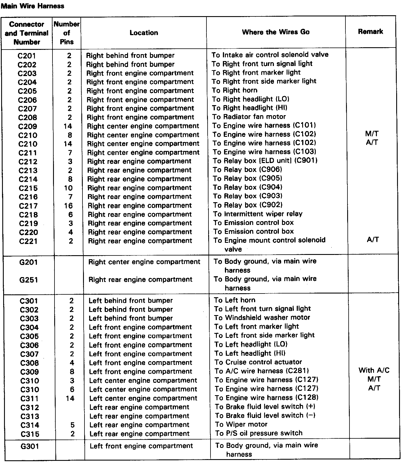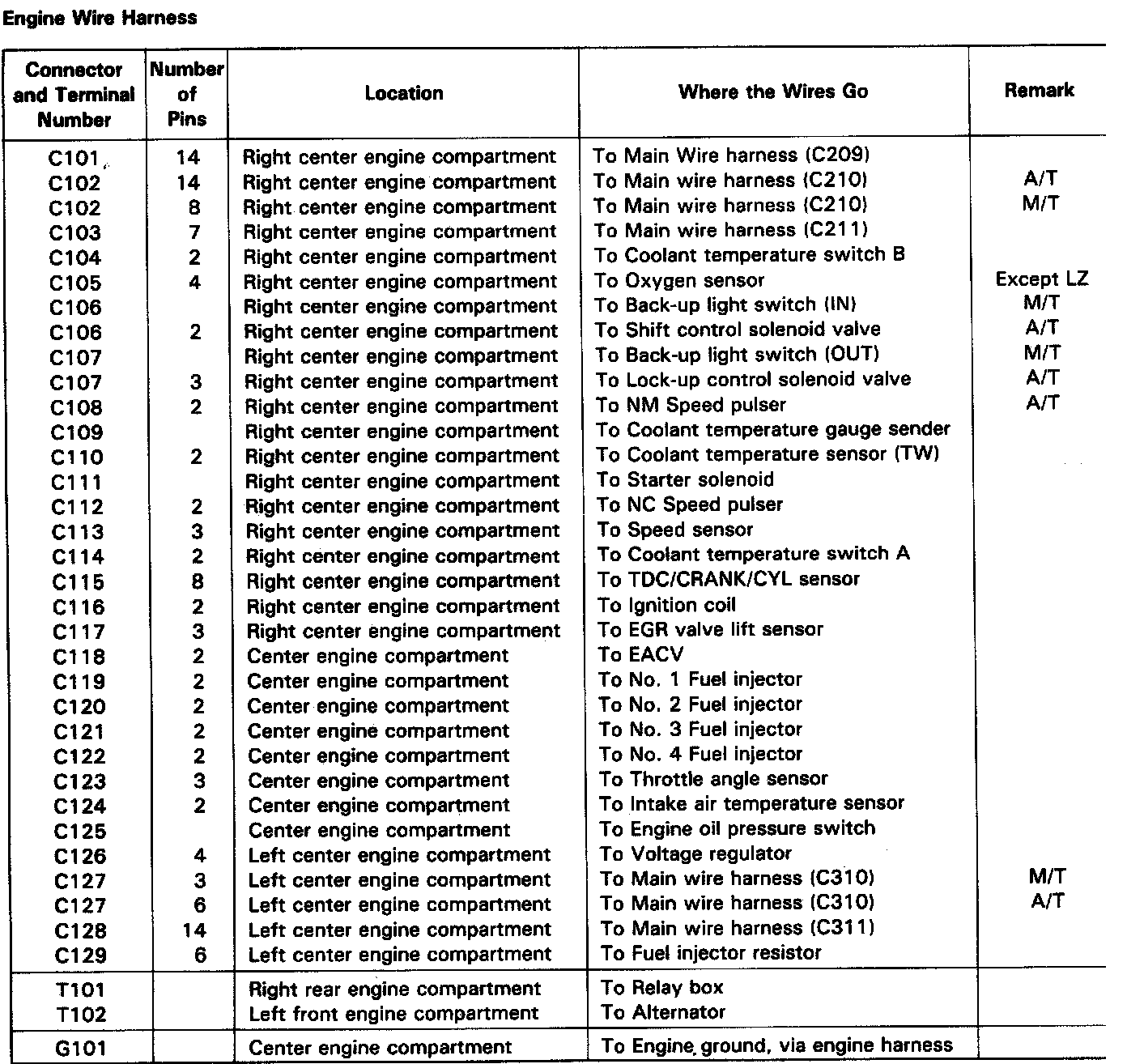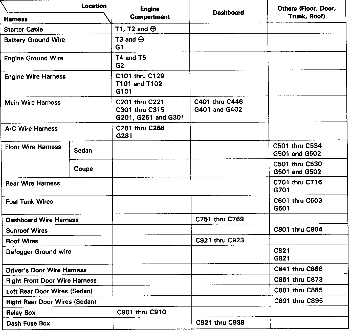 Identifying numbers have been assigned to all connectors. The number is preceded by the letter "C" for connectors, "G" for ground terminals or "T" for non ground terminals.