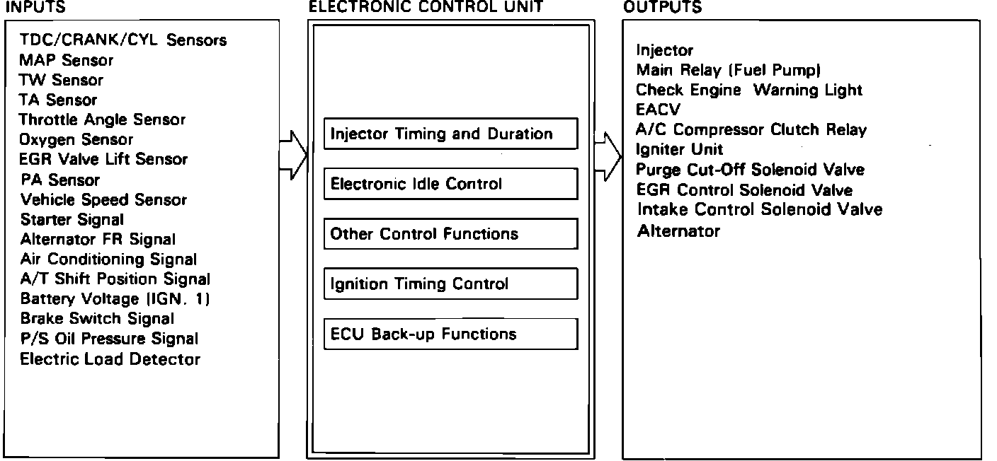 The ECU contains memories for the basic discharge durations of the fuel injectors (determining the air/fuel mixture) at various engine speeds and manifold pressures. The basic discharge duration of the fuel injector is modified by signals from various sensors to obtain the final discharge duration. The oxygen sensor is a main input component for the air/fuel mixture control.