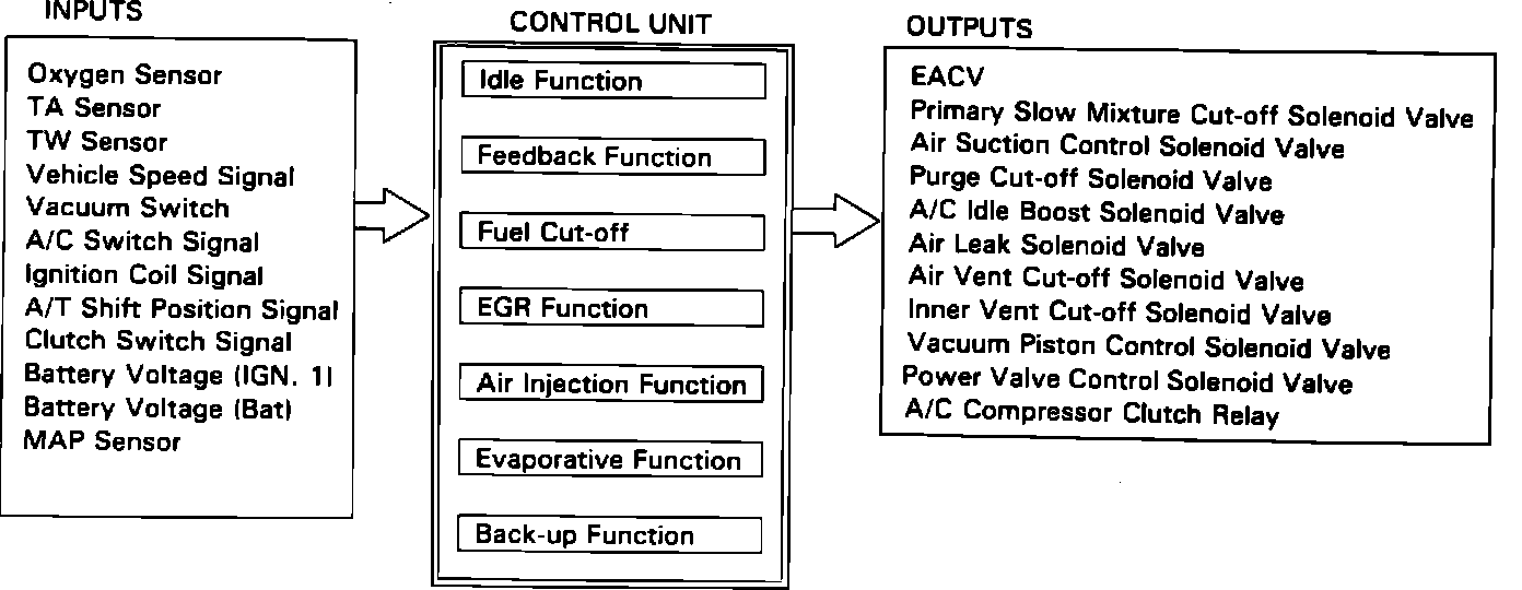 The PGM-CARB Unit is a dedicated microcomputer which reads the signals from the various input devices and, based on the program contained in ROM, determines current driving conditions. Once driving conditions are known, the output devices are used to optimize engine efficiency thereby providing maximum attainable fuel economy and minimum achievable emissions output.