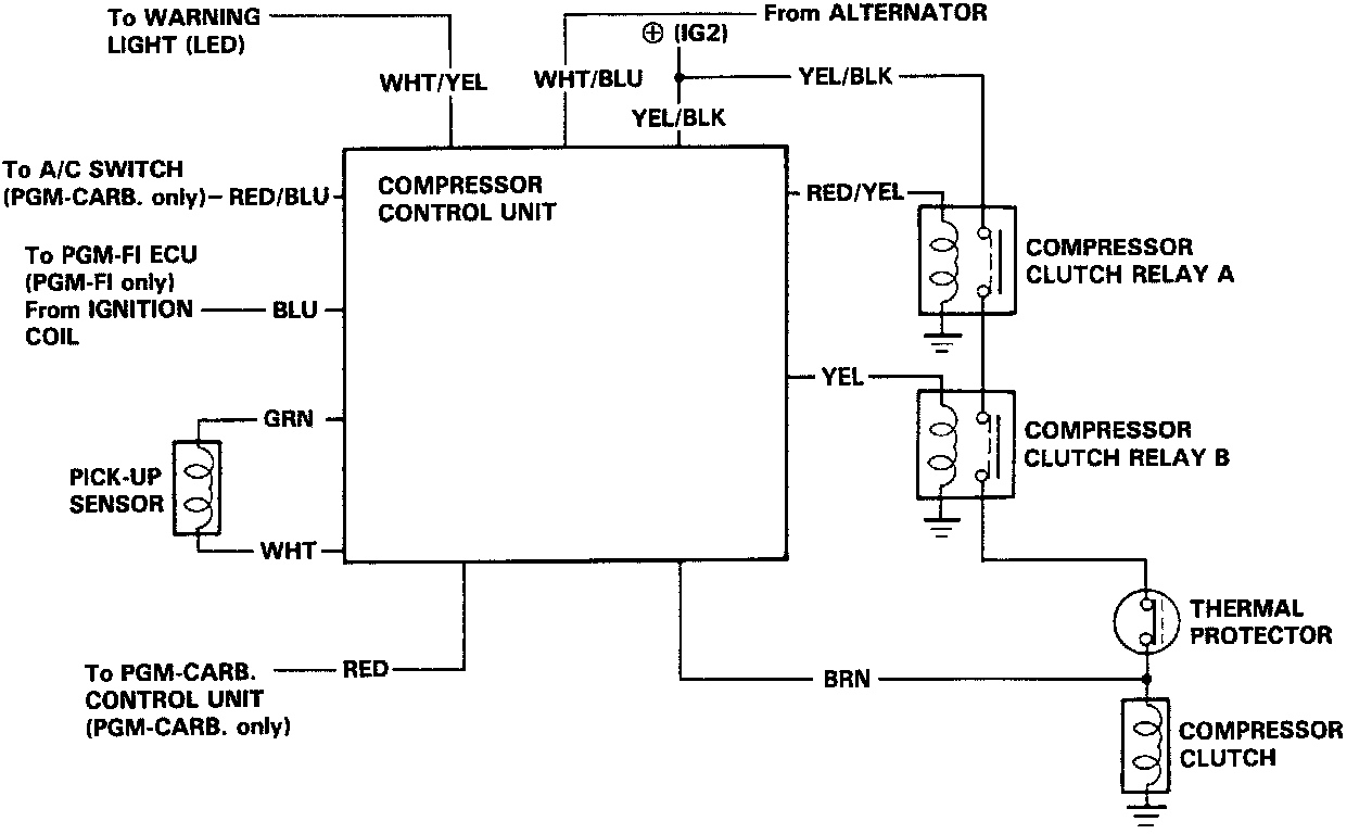 Compressor Control System DescriptionThe compressor control unit has a system designed to protect the compressor belt in the event of a seizure, thereby allowing the alternator to continue operating.