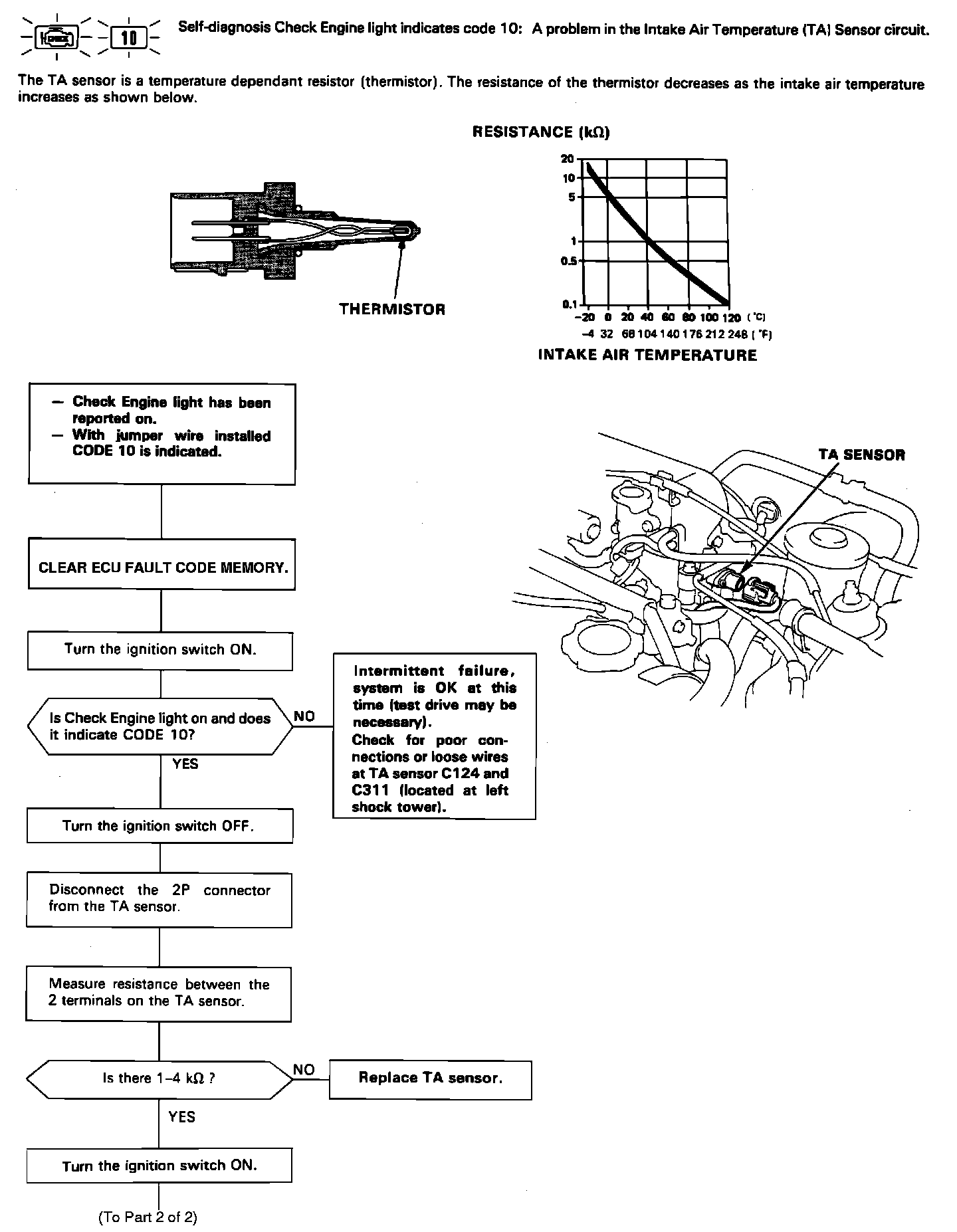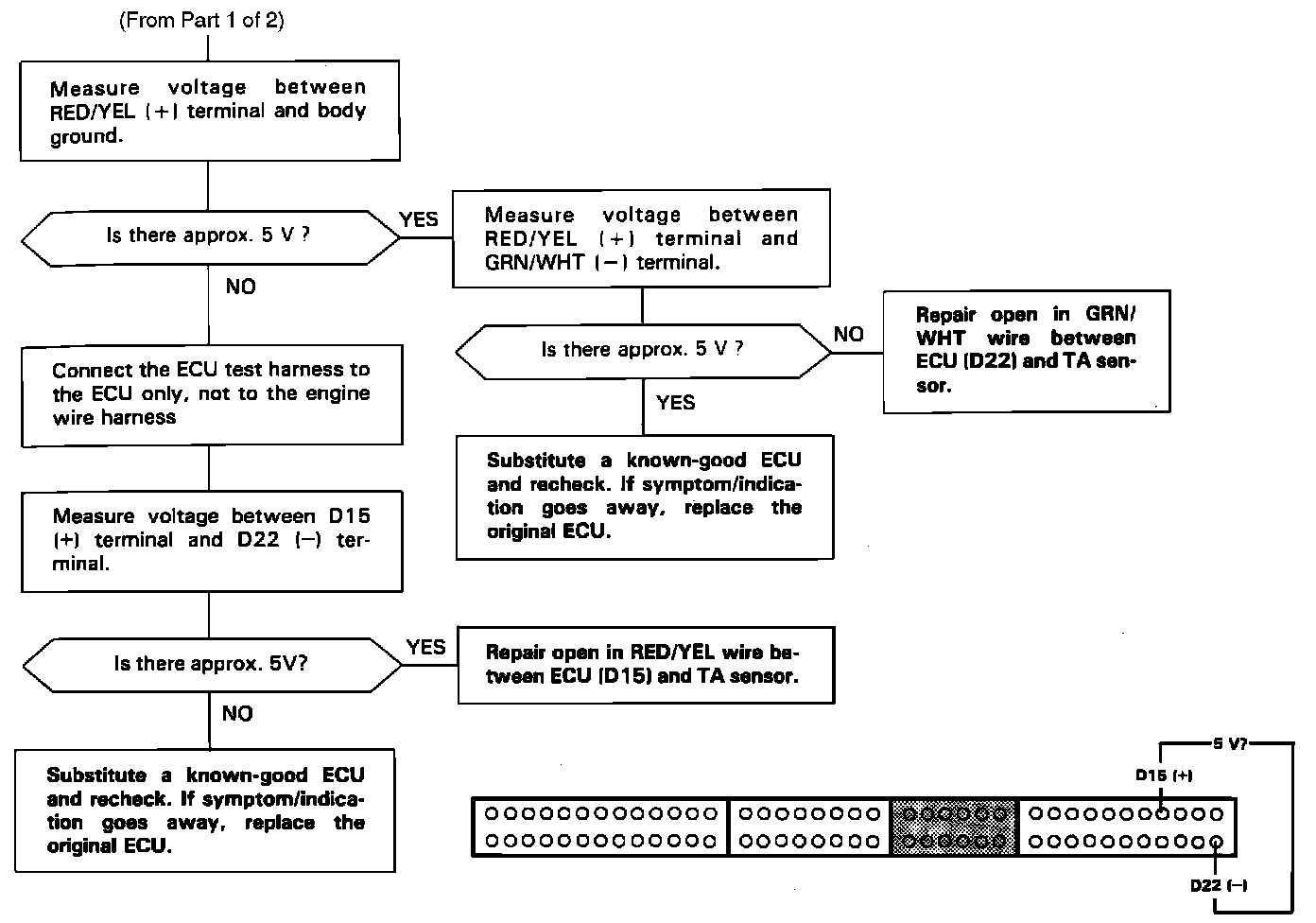 The TA sensor is a temperature dependant resistor (thermistor). The resistance of the thermistor decreases as the intake air temperature increases as shown.