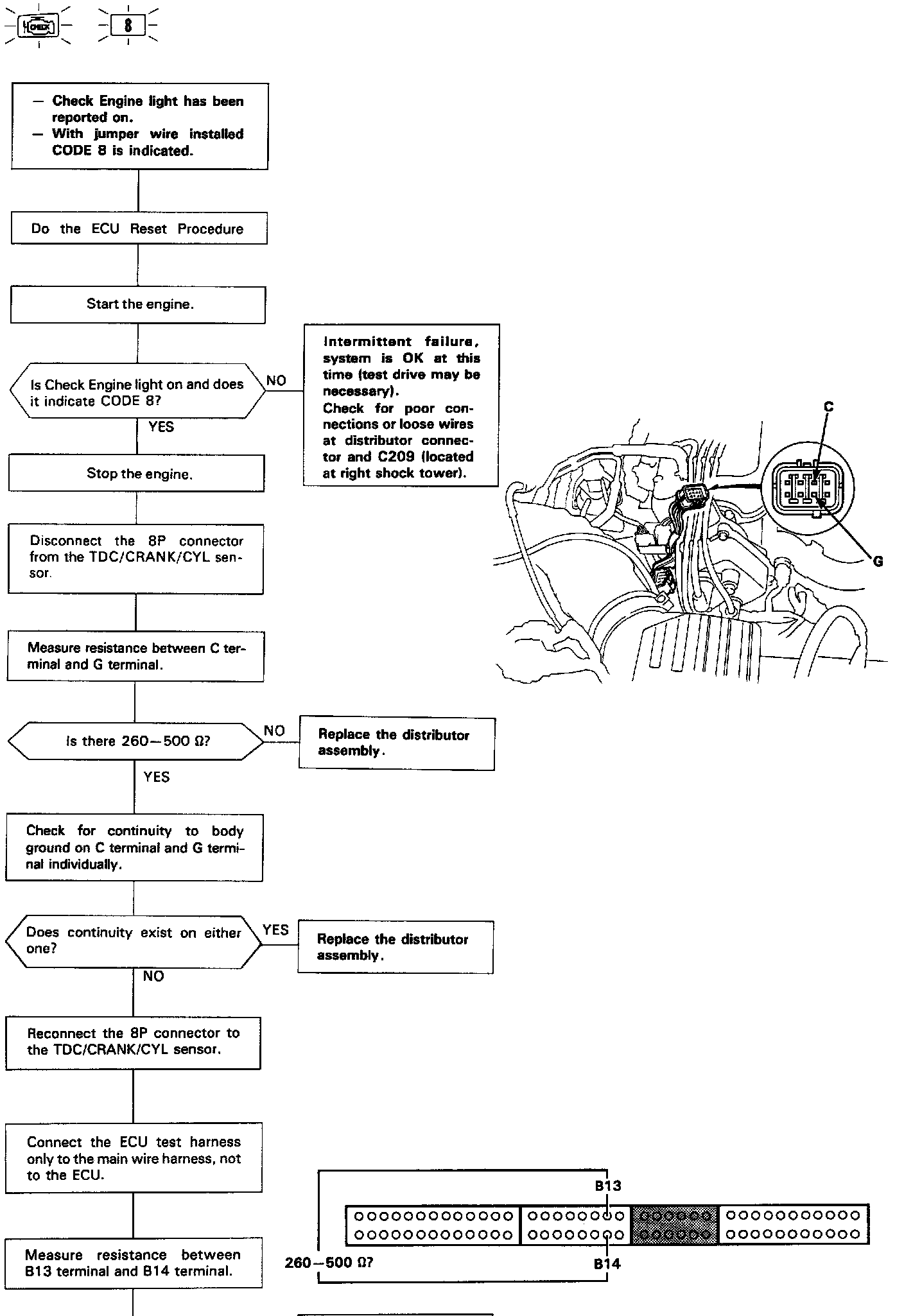 Self-diagnosis LED indicator blinks eight times:A problem in the TDC circuit of the Crank Angle Sensor.