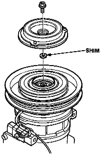 Measure the clearance between the pulley and pressure plate all the way around. If the clearance is not within specified limits, the pressure plate must be removed and shims added or removed as required.