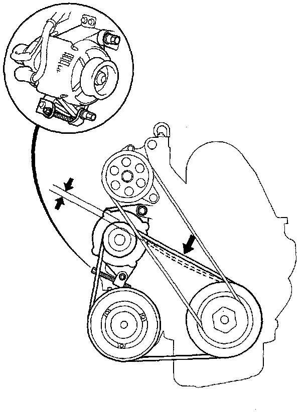 1. Apply a force of 100 N (10 kg, 22 lbs) and measure the deflection between the alternator and crankshaft pulley.