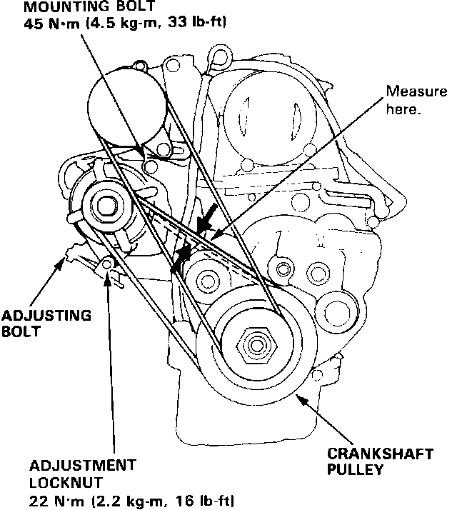 1. Apply a force of 100 N (10 kg, 22 lbs) and measure the deflection between the alternator and crank- shaft pulley.