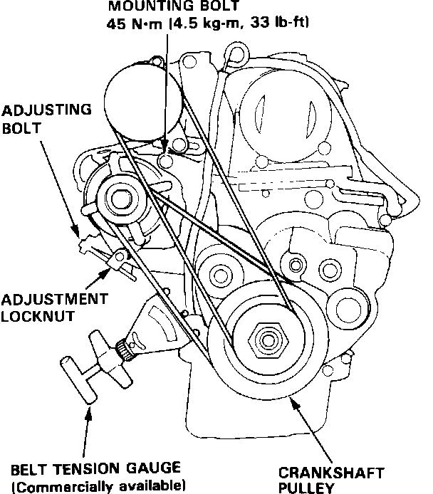 3. Turn the adjusting bolt to obtain the proper belt tension, then retighten the nut and mounting bolt.