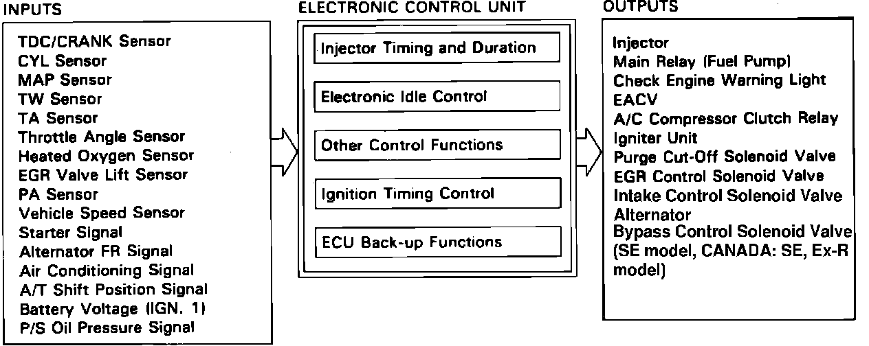 The ECU contains memories for the basic discharge durations at various engine speeds and manifold pressures. The basic discharge duration, after being read out from the memory, is further modified by signals sent from various sensors to obtain the final discharge duration. The most vital of these sensors are: Coolant Temperature (TW) sensor, Intake Air Temperature (TA) sensor, Oxygen sensor, and the Atmospheric Pressure (PA) sensor.