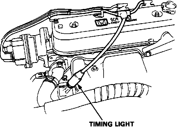 4. Connect a timing light to the No. 1 ignition wire; while the engine idles, point the light toward the pointer on the flywheel (for M/T), or on the drive plate (for A/T).
