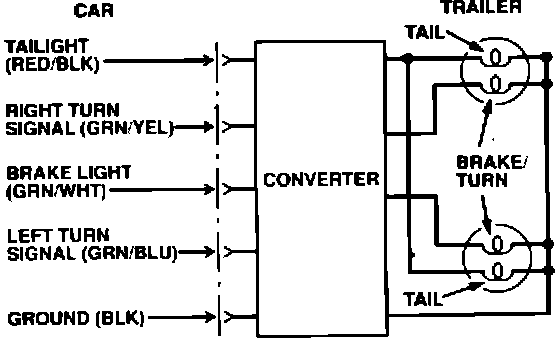The converter (which is about the size of a cigarette pack, and therefore easy to stash in the trunk) changes the brake and turn inputs into the appropriate signals to the trailer lights.