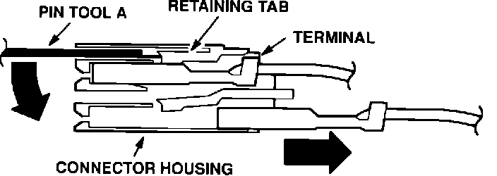 ^ The connectors have a retainer that keeps the terminals from sliding out the back of the housing. Carefully release the tab on each side of the retainer, then swing the retainer out of the way.