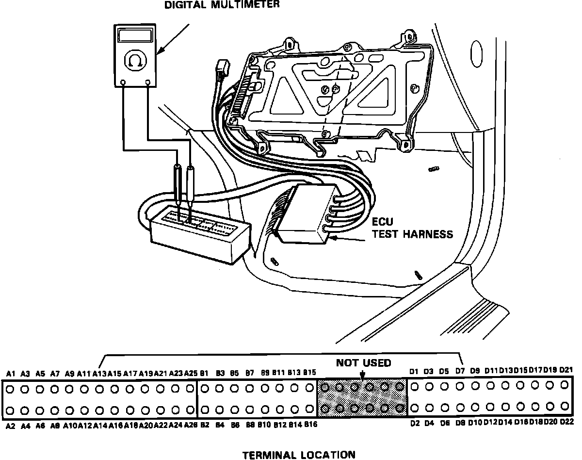 If the inspection for a particular failure code requires the ECU test harness, remove the right door sill molding, the small cover on the right kick panel, and pull the carpet back to expose the ECU. Unbolt the ECU bracket. Connect the ECU test harness. Then check the system according to the procedure described for the appropriate code(s) listed. The purpose of the ECU test harness is to allow circuit testing without having to back-probe the ECU harness. If the ECU test harness is unavailable, CAREFUL back probing of the ECU harness will have to be performed.