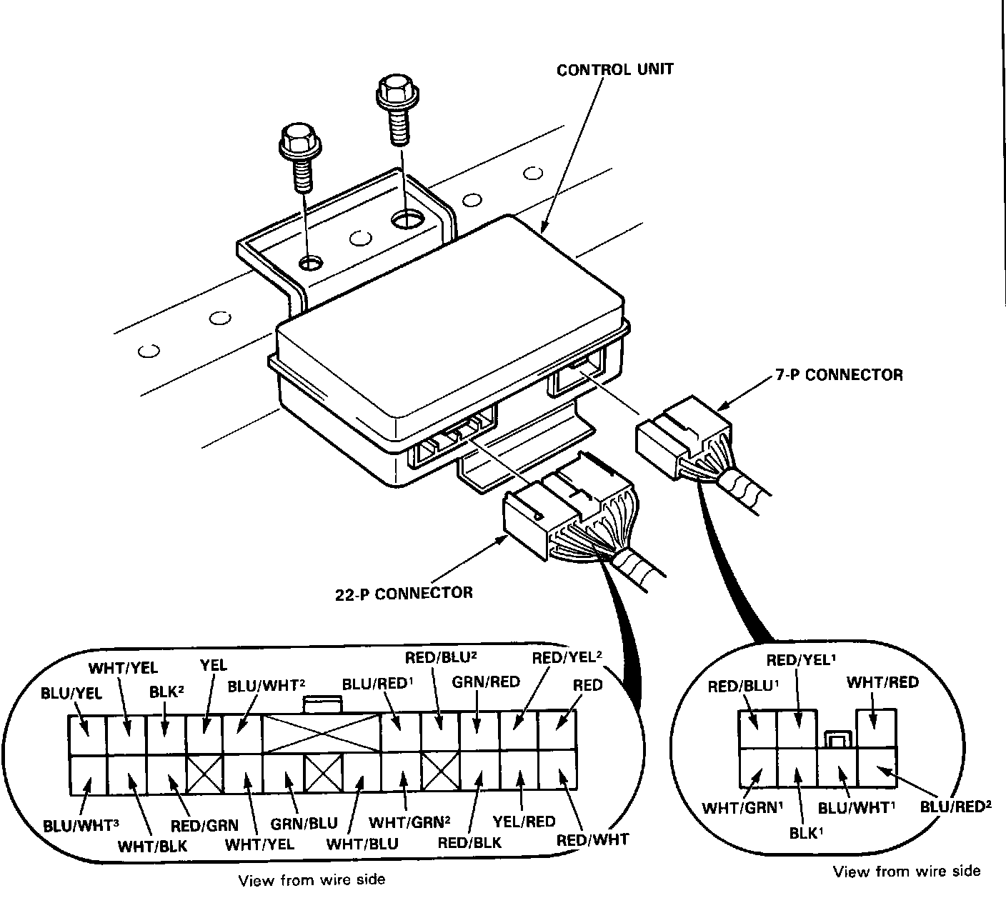 Control Unit Input TestDisconnect the 7-P and 22-P connectors from the control unit, located under the right front seat.