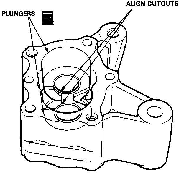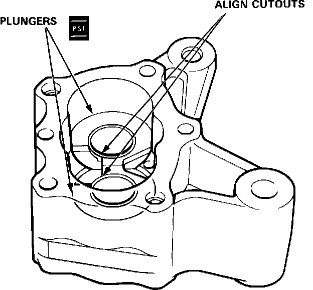 1. Coat the outer surfaces of the plungers with power steering fluid, then install them in the pump housing. Make sure the plunger holes are positioned as shown.