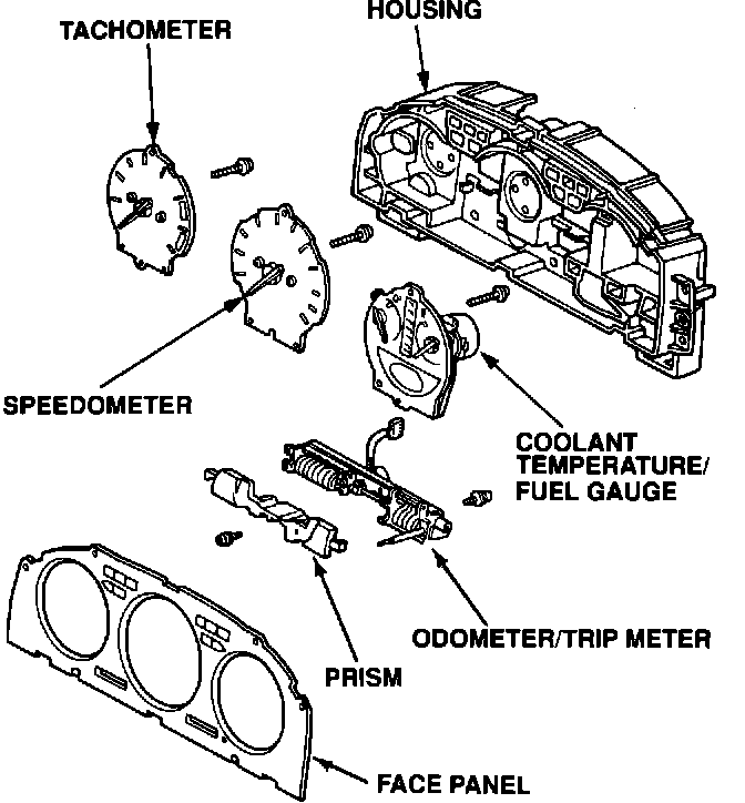 7. Remove the face panel from the housing. Remove the tachometer, speedometer, and coolant temperature/fuel gauge from the housing.