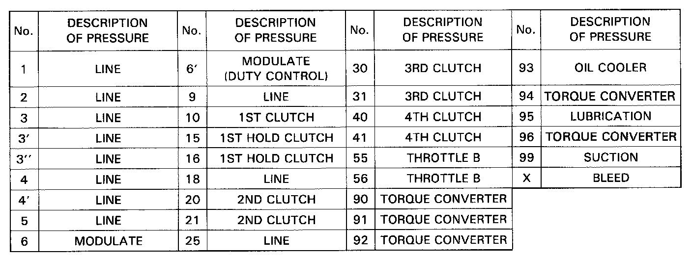 As the engine turns, the oil pump also starts to operate. Automatic transmission fluid (ATF) is drawn from (99) and discharged into (1). Then, ATF pressure is controlled by the regulator valve and becomes the line pressure (1). The torque converter inlet pressure (1) enters (94) of torque converter through the orifice and discharges into (90). The torque converter check valve prevents the torque converter pressure from falling~