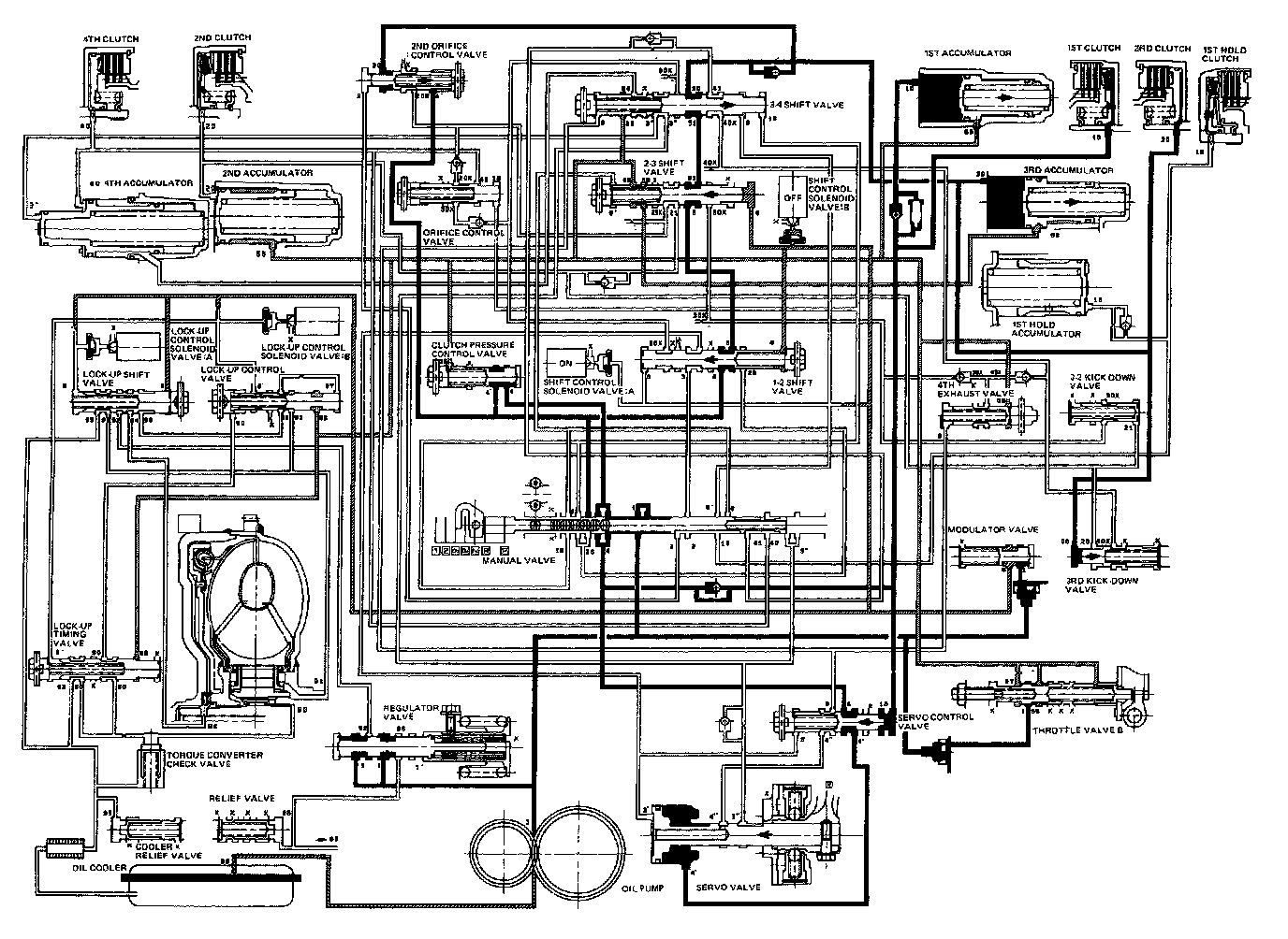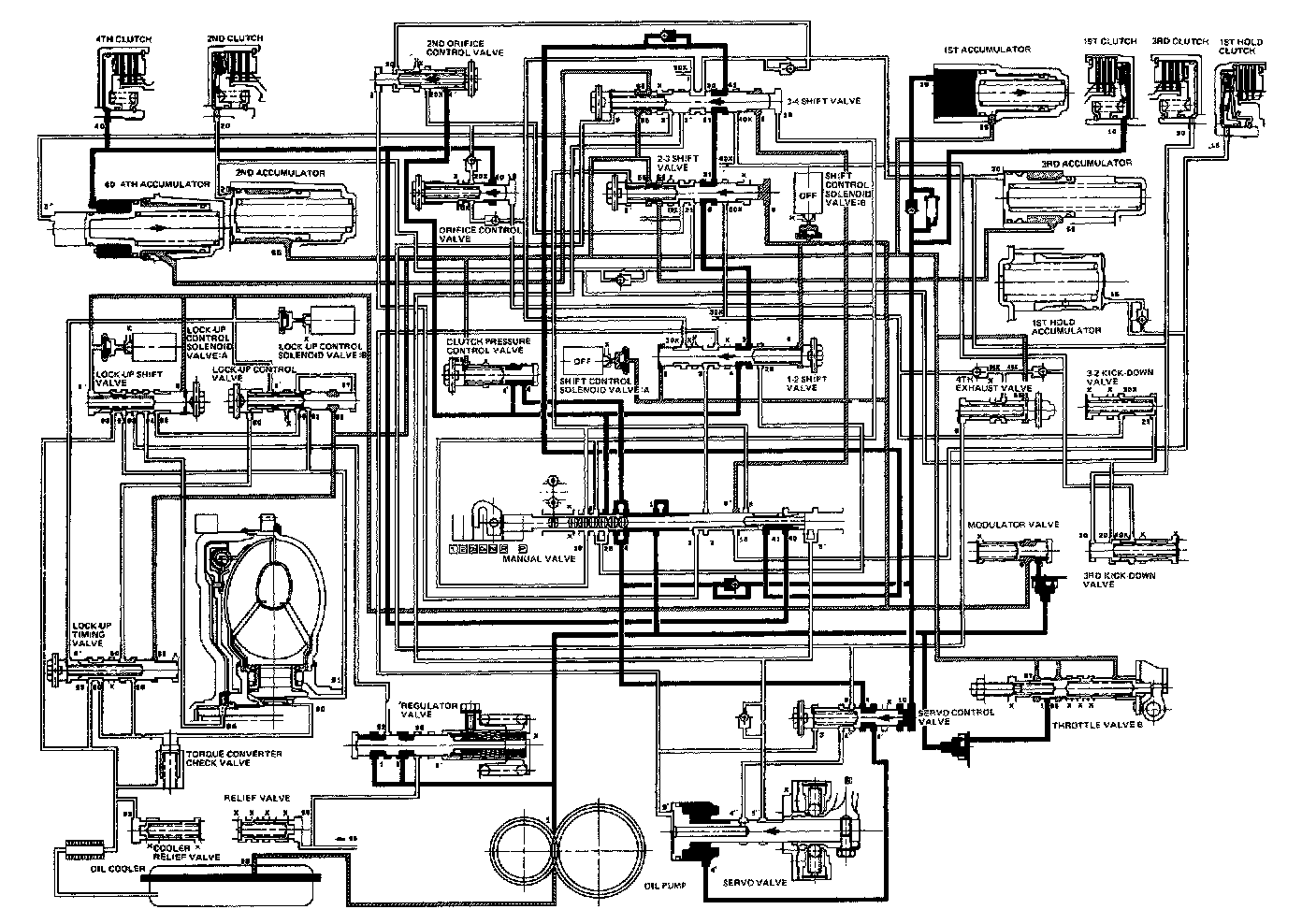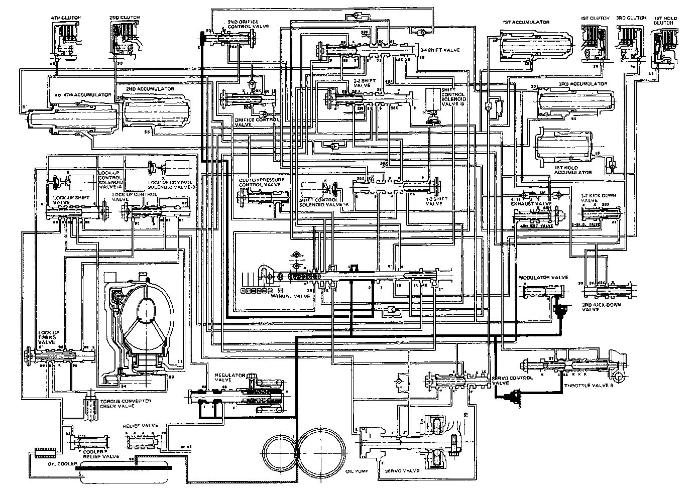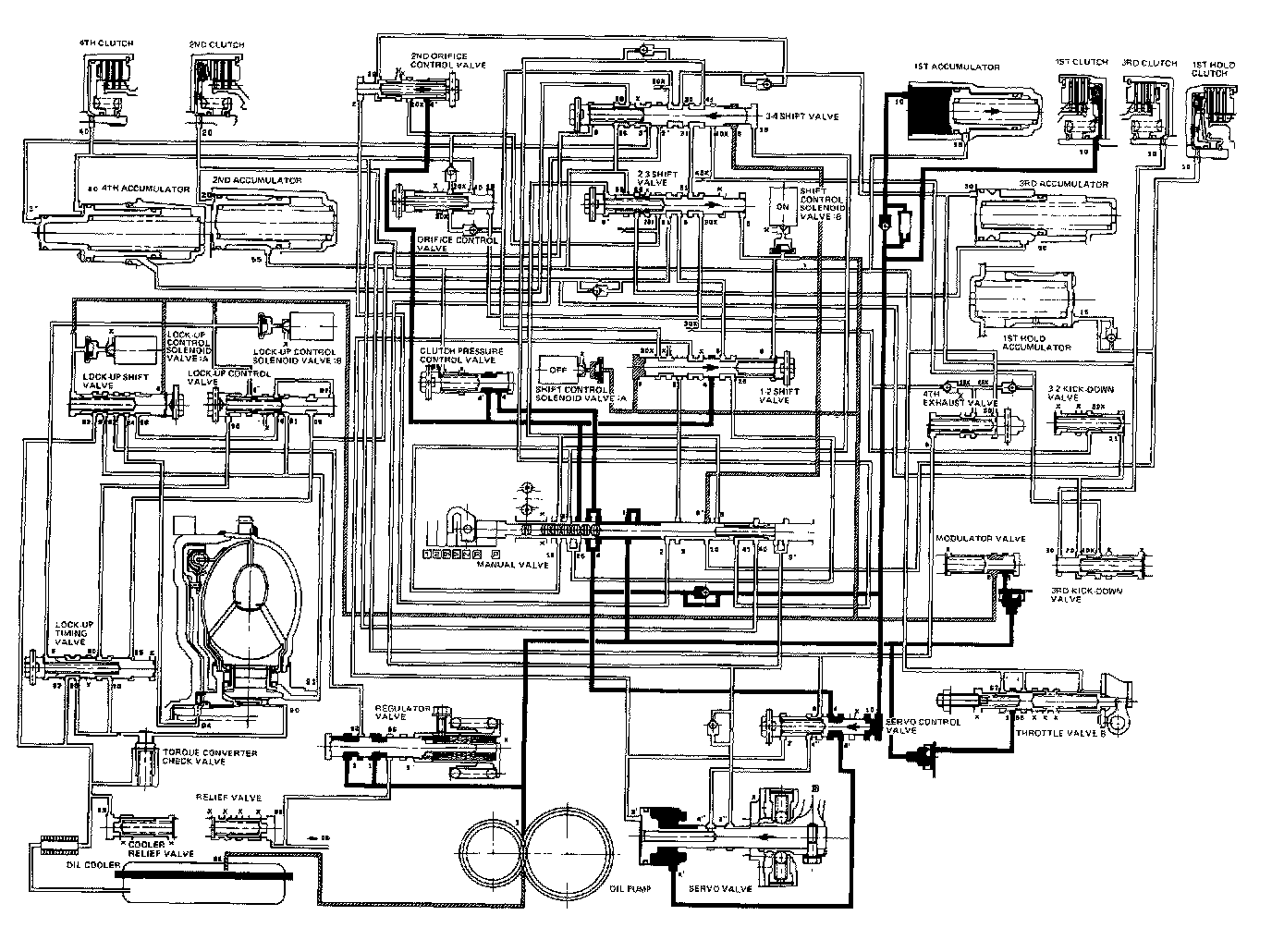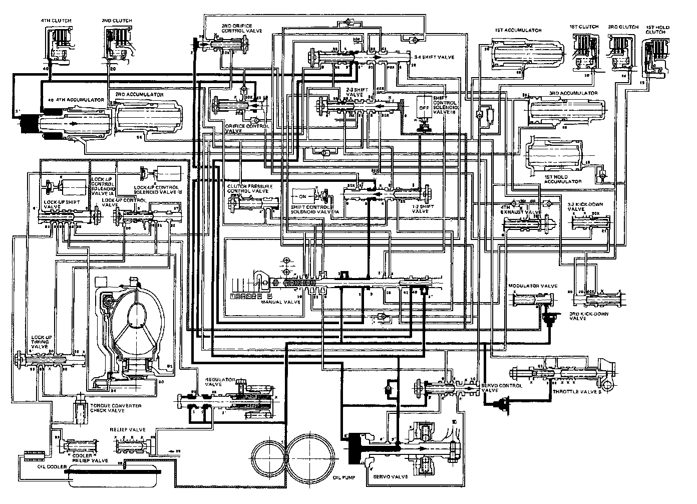 -Line Pressure (4)->1-2 Shift Valve-->2-3 Shift Valve-3rd Clutch Pressure (31)->3-4 Shift Valve (not controlled)