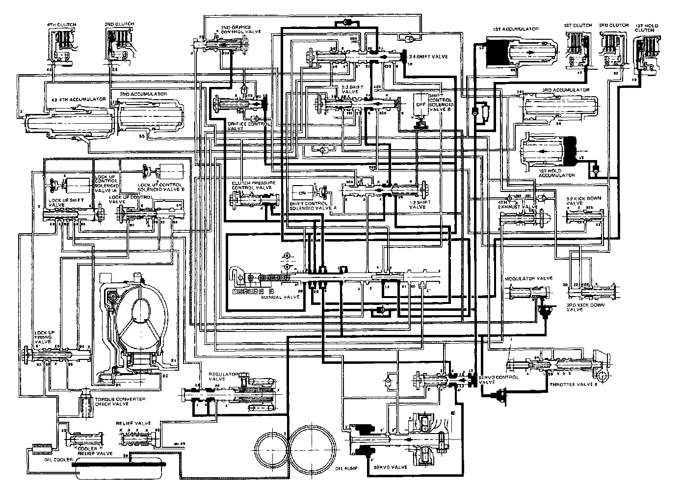 The line pressure (4) also flows to the servo valve and line pressure (1) also flows to throttle valve B.