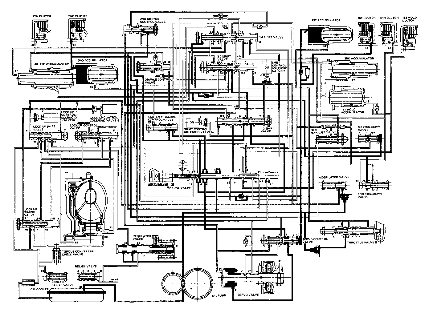 Under this condition, the shift control solenoid valve A is turned on whereas the valve B is turned off as in 3rd. As a result, the 1-2 shift valve is also moved to the left. The fluid (3)' will flow through the servo valve and manual valve to the 4th clutch; power is transmitted through the 4th clutch.