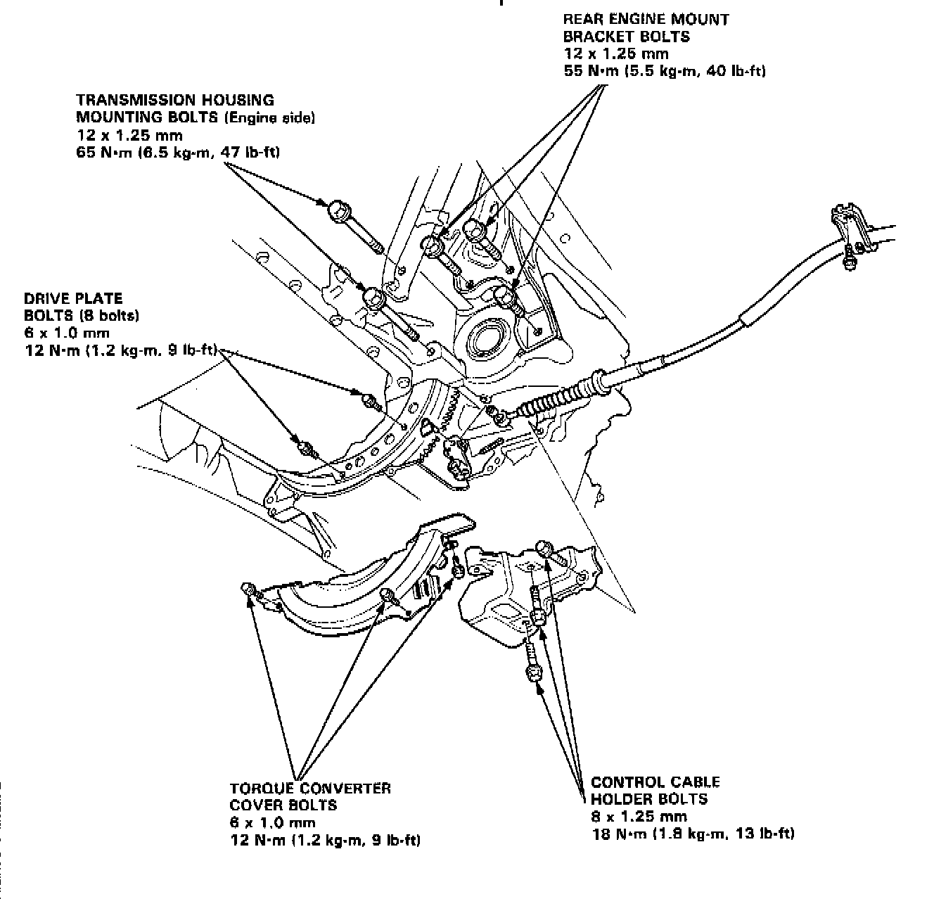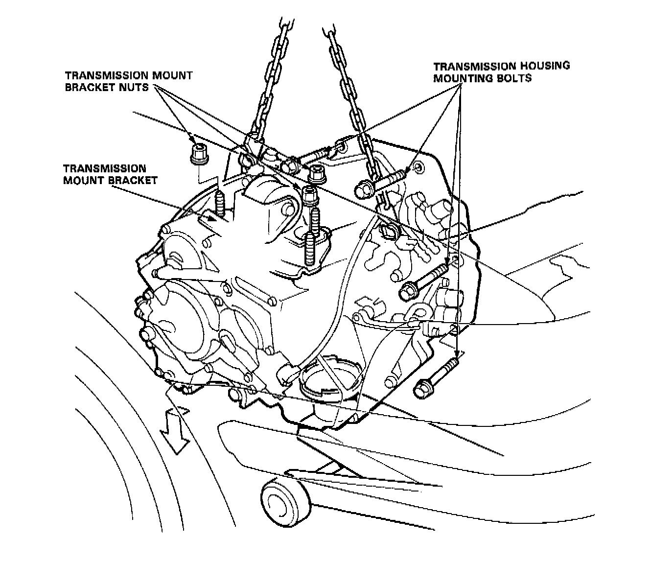 24. Remove the remaining transmission housing bolts and three mount bracket nuts.