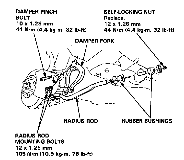 16. Remove the bolts and nuts, then remove the right radius rod.