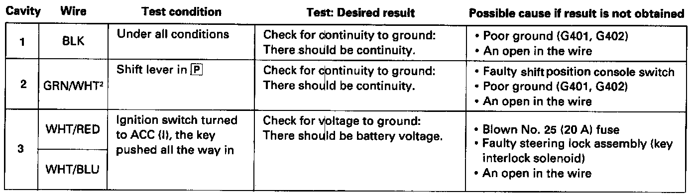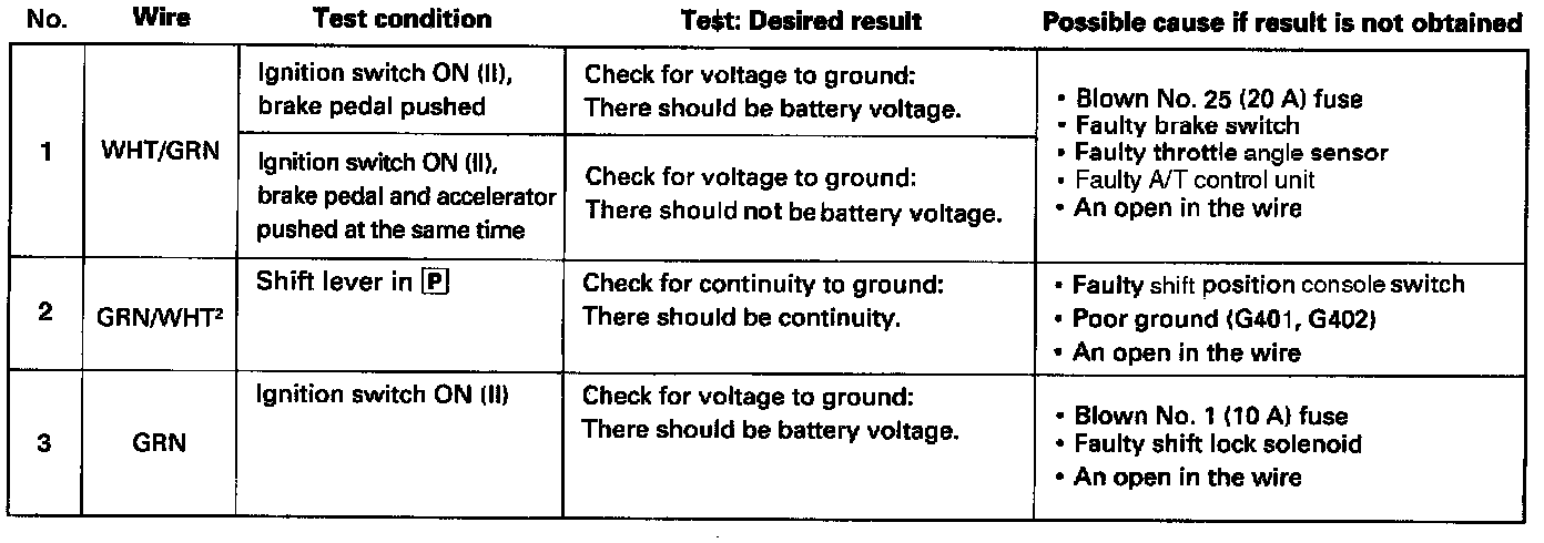 NOTE: If the shift lock solenoid clicks when the ignition switch is turned ON (II) and you step on the brake pedal (with the shift lever in [P]), the shift lock system is electronically normal; if the shift lever cannot be shifted from [P], test the A/T gear position.