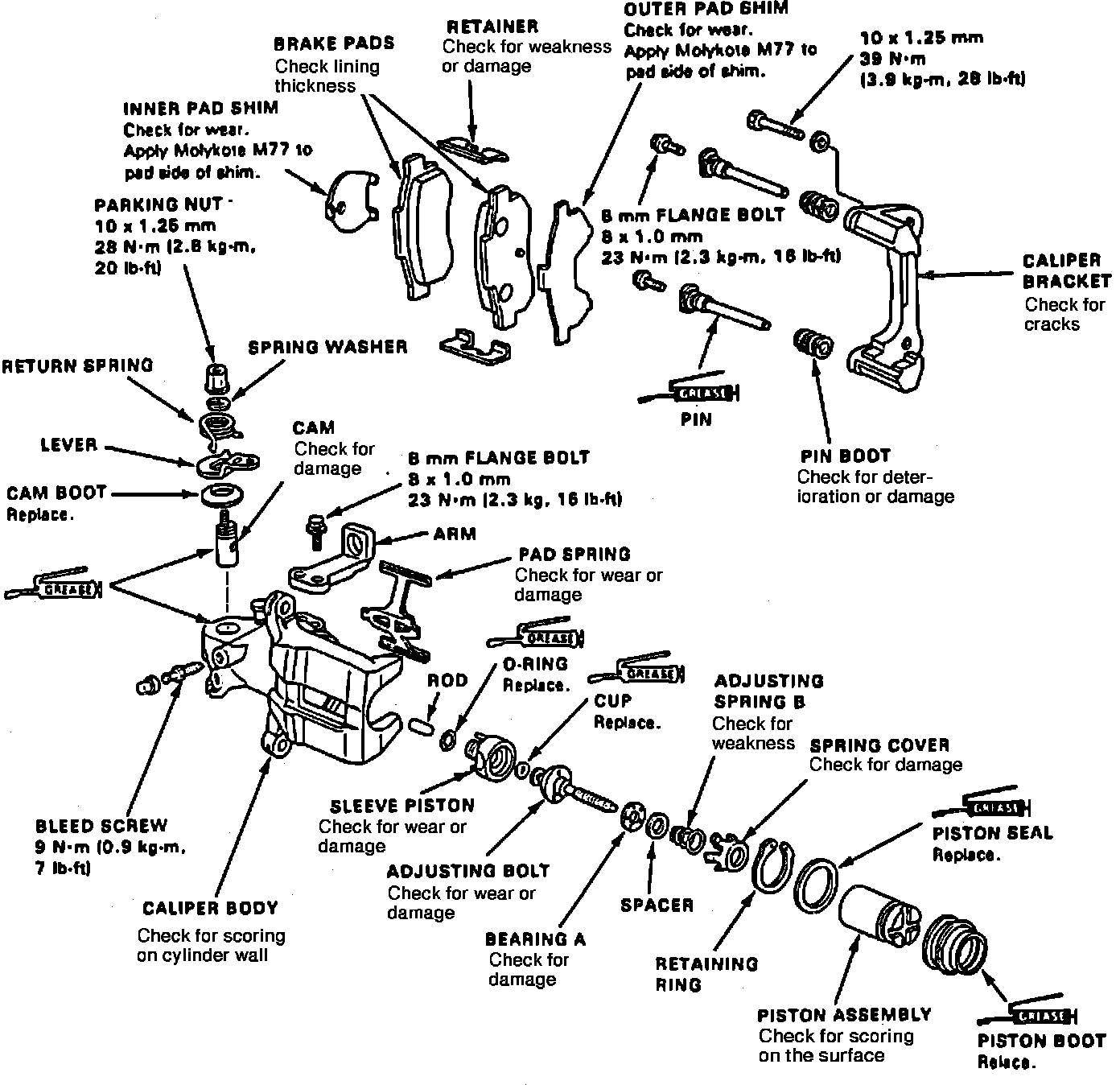 9. Fit bearing A, spacer, adjusting spring B and spring cover on adjusting bolt, then install in caliper cylinder.