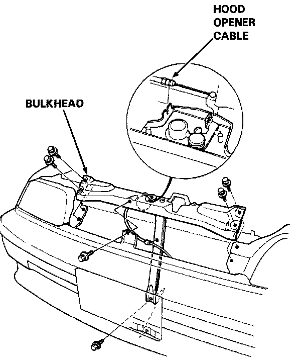 6. Remove the front bulkhead with six bolts, then remove the hood opener cable.