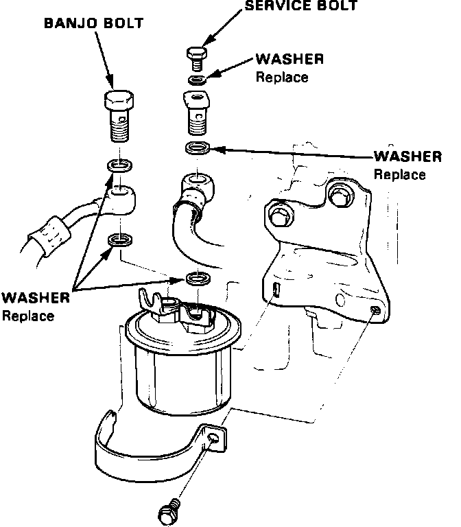 6. Torque the fuel filter clamp bolt to 7 lb-ft (10 Nm). Torque the banjo bolts to 16 lb-ft (22 Nm). Torque the service bolt to 9 lb-ft (12 Nm).