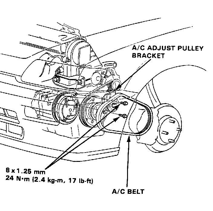 2. Remove the A/C compressor adjust pulley with bracket and the belt (with A/C).