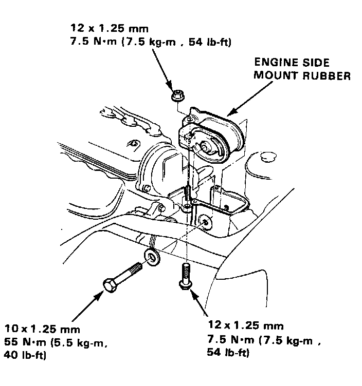 5. Remove the engine support bolts and nut, then remove the side mount rubber.
