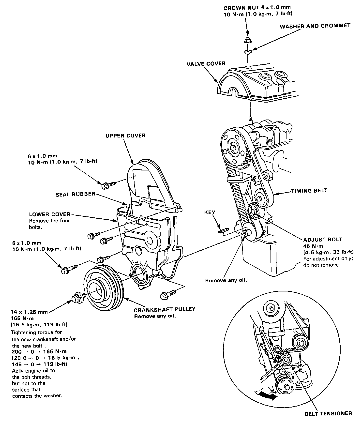 5 If the pulley bolt broke loose during tightening, tighten the crankshaft pulley bolt to 200 N-m (20.0 kg-m, 145 lb-ft),Loosen bolt, retighten it to 165 N-m (16.5 kg-m, 119 lb-ft).