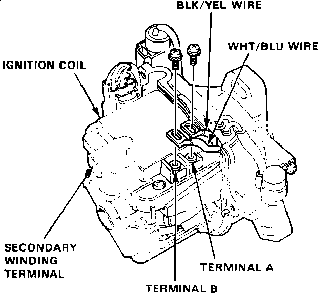 3. Using an ohmmeter, measure the resistance of the primary winding between the A and B terminals. Replace the coil if the resistance is not within specifications.