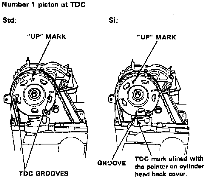 2. Set No. 1 piston at TDC. "UP" mark on the pulley should be at top, and TDC grooves on the pulley should align with cylinder head surface. The distributor rotor must be pointing towards No. 1 plug wire.