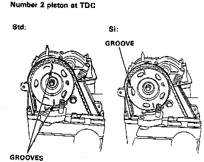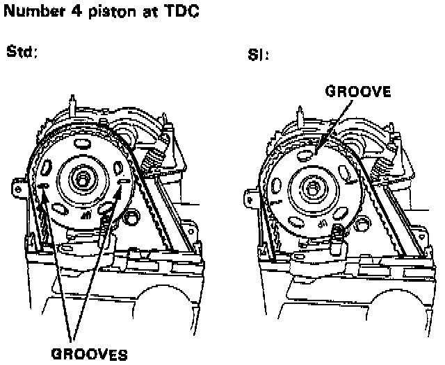 7. Rotate crankshaft 180° counterclockwise to bring No. 4 piston to TDC. Both TDC grooves are once again visible and distributor rotor points to No.4 plug wire. Adjust valves on No.4 cylinder.
