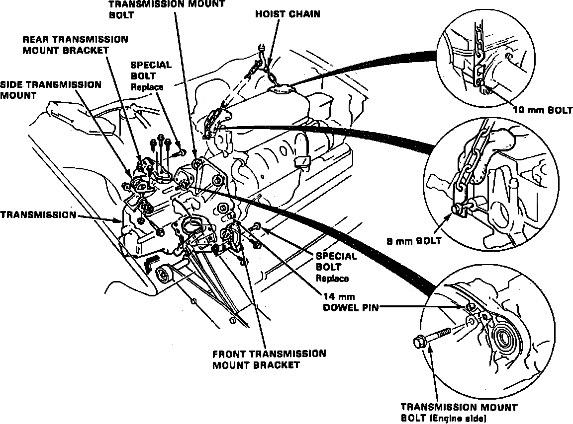 18. Support transmission with a suitable jack and raise to take weight off mounts.