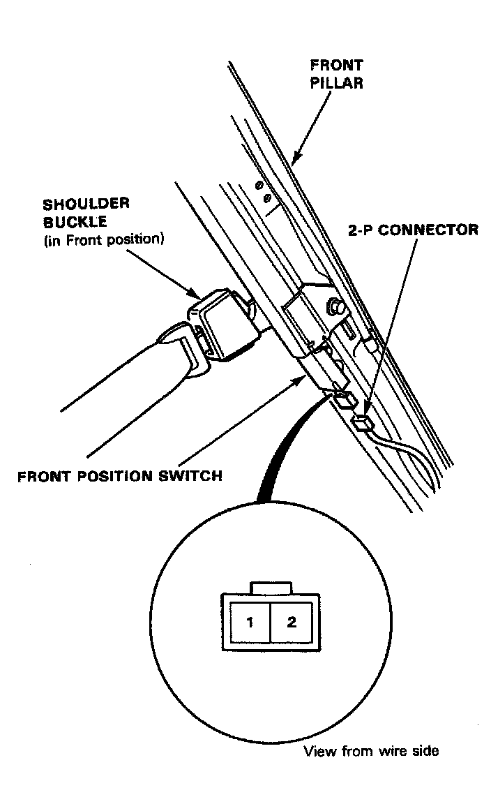 3. Check for continuity between the No.1 and No.2 terminals. There should be no continuity when the shoulder buckle is in the front position. There should be continuity when the shoulder buckle is not in the front position.