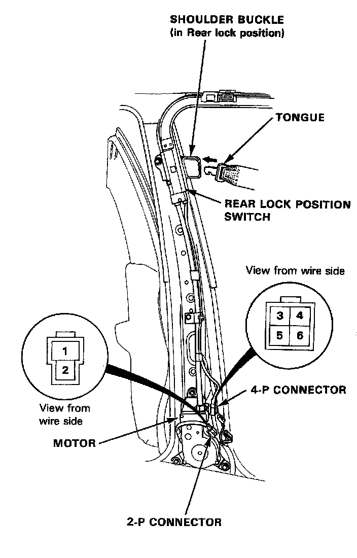2. Disconnect the 2-P connector from the shoulder buckle motor and the 4-P connector from the rear lock position switch.