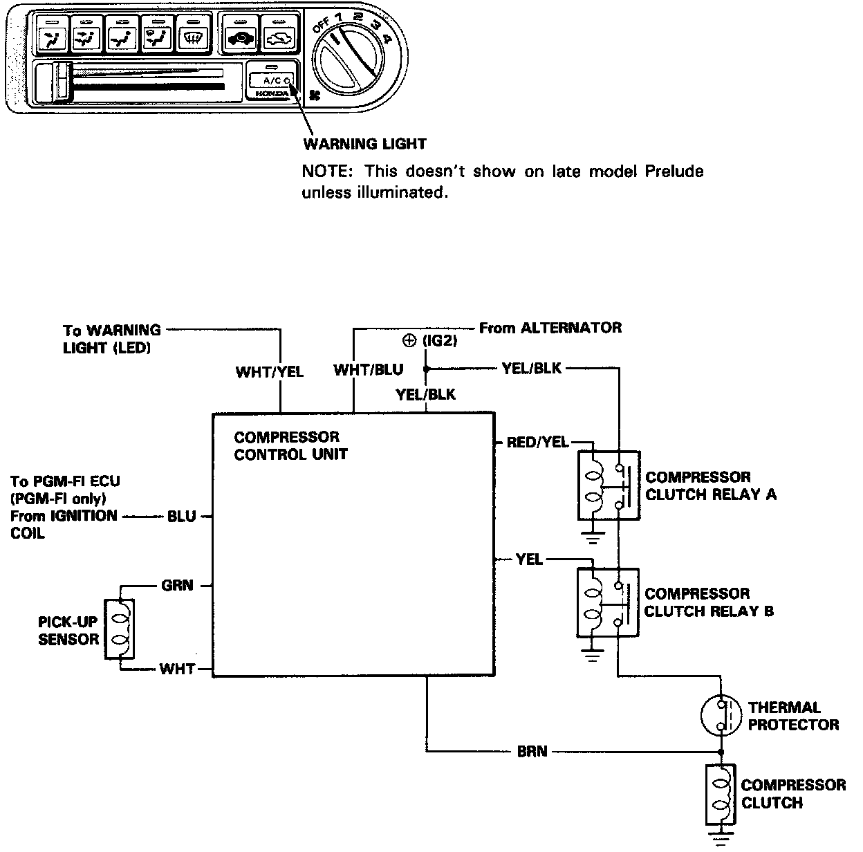 This is done by comparing the engine rpm and the compressor pulley rpm. When there is a difference in rpm that continues for more than 3 seconds, the compressor relays are turned off and the warning light comes on.