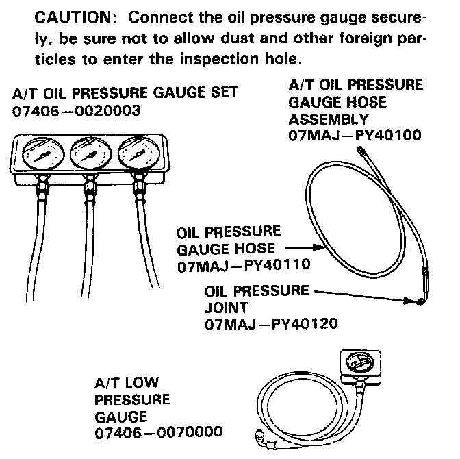 NOTE: Use the A/T Oil Pressure Gauge Set or A/T Low Pressure Gauge and the Oil Pressure Gauge Hose Assembly.