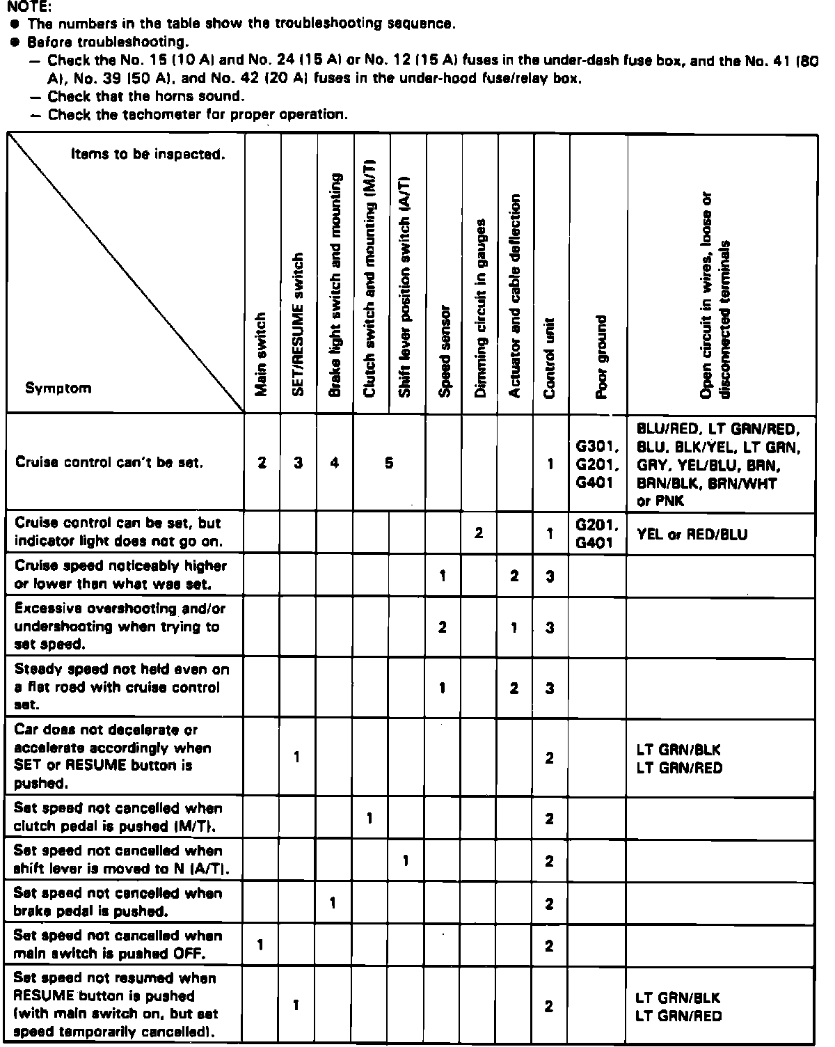 Prior to troubleshooting the speed control system, check No. 15 (10A), No. 24 (15A) and No 12 (15A) fuses in the fuse box and the No. 41 (80A), No. 39 (50A) and the No. 42 (20A) fuses in the relay box. If fuses are operating, ensure horn sounds properly. then refer to Fig. 5 for troubleshooting sequence.