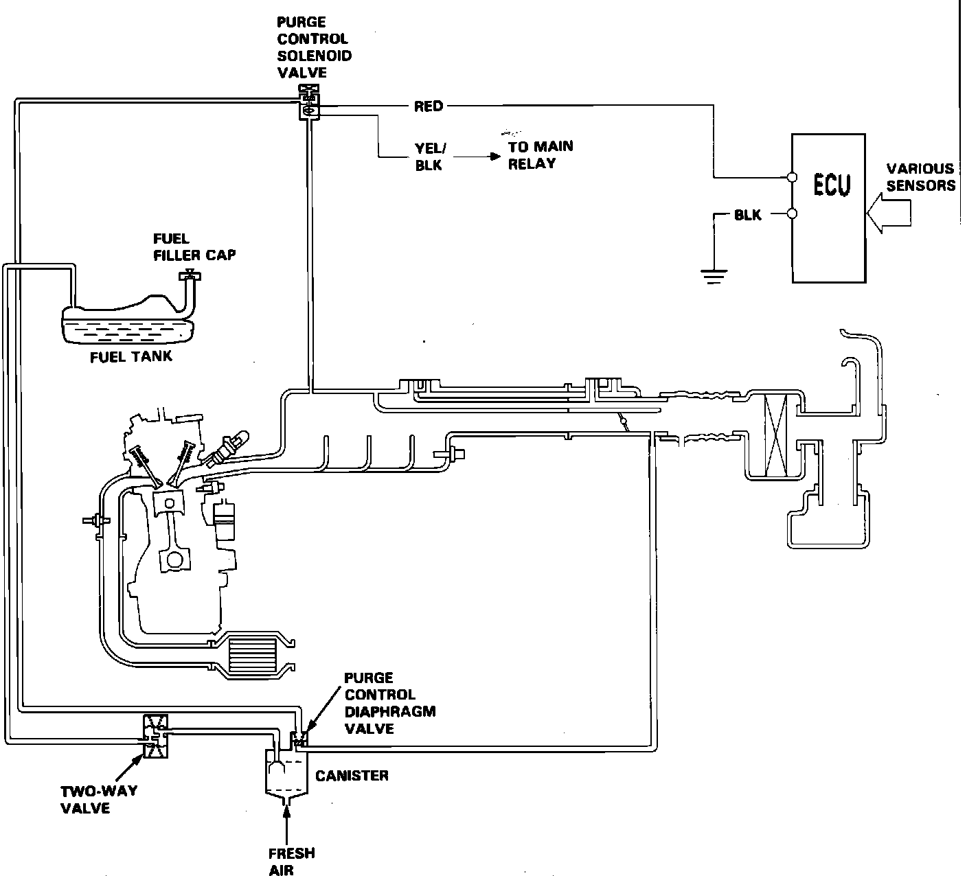 Canister purging is accomplished by drawing fresh air through the canister and into a port on the throttle body. The ported vacuum is controlled by the purge control solenoid valve, located drivers side of engine compartment, bolted to the firewall next to the brake master cylinder and the purge control diaphragm valve, located on top of the charcoal canister. The purge control solenoid turns off after the engine is started, if the coolant temperature is above 167°F (75°C) on 16 VALVE VTEC (D15Z1): engine, or 158°F (70°C) for all other engines.